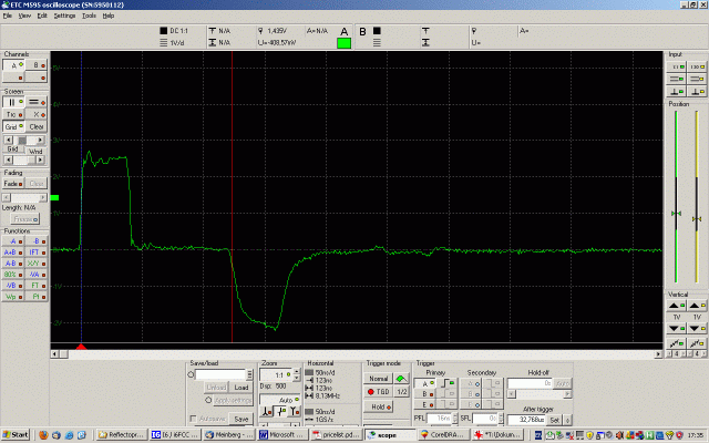 The scope has a BNC female as its input. The reflectoprobe is mechanically a small "passthrough" box that plugs straight into the scope's hi-Z input, thus avoding any universal scope probes, which tend to have limited bandwidth. Therefore, the reflectoprobe has a BNC male towards the scope, and a BNC female towards the (coax) cabling. In parallel to the cabling-bound BNC, there is a 2.54mm pin header (two pins, like a jumper) for direct attachment to twisted-pair cabling. Actually I have a pigtail with the corresponding straight connector crimped on, which I can easily attach to wiring terminals of RS485 busses etc.