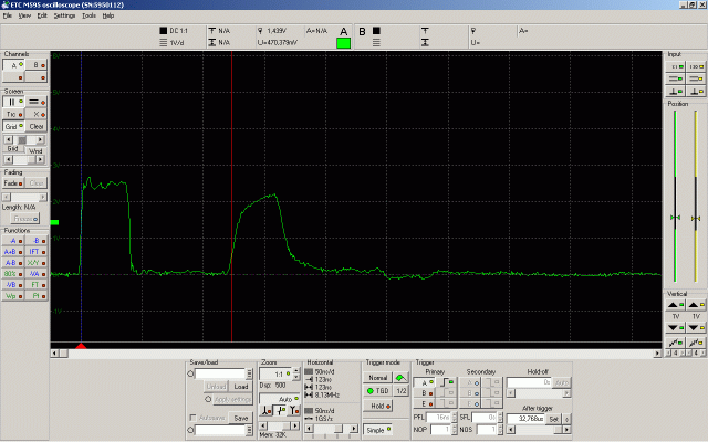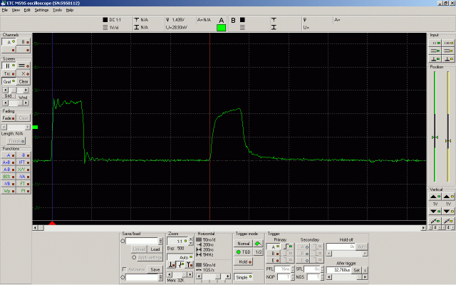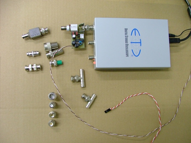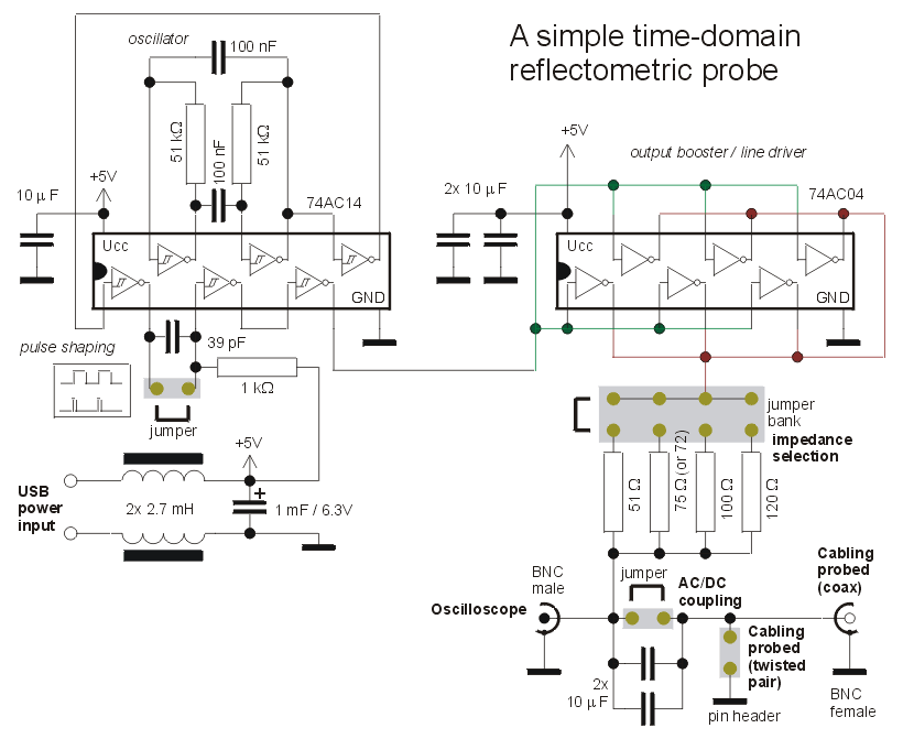 The scope has a BNC female as its input. The reflectoprobe is mechanically a small "passthrough" box that plugs straight into the scope's hi-Z input, thus avoding any universal scope probes, which tend to have limited bandwidth. Therefore, the reflectoprobe has a BNC male towards the scope, and a BNC female towards the (coax) cabling. In parallel to the cabling-bound BNC, there is a 2.54mm pin header (two pins, like a jumper) for direct attachment to twisted-pair cabling. Actually I have a pigtail with the corresponding straight connector crimped on, which I can easily attach to wiring terminals of RS485 busses etc.