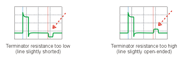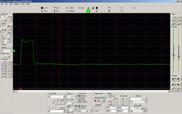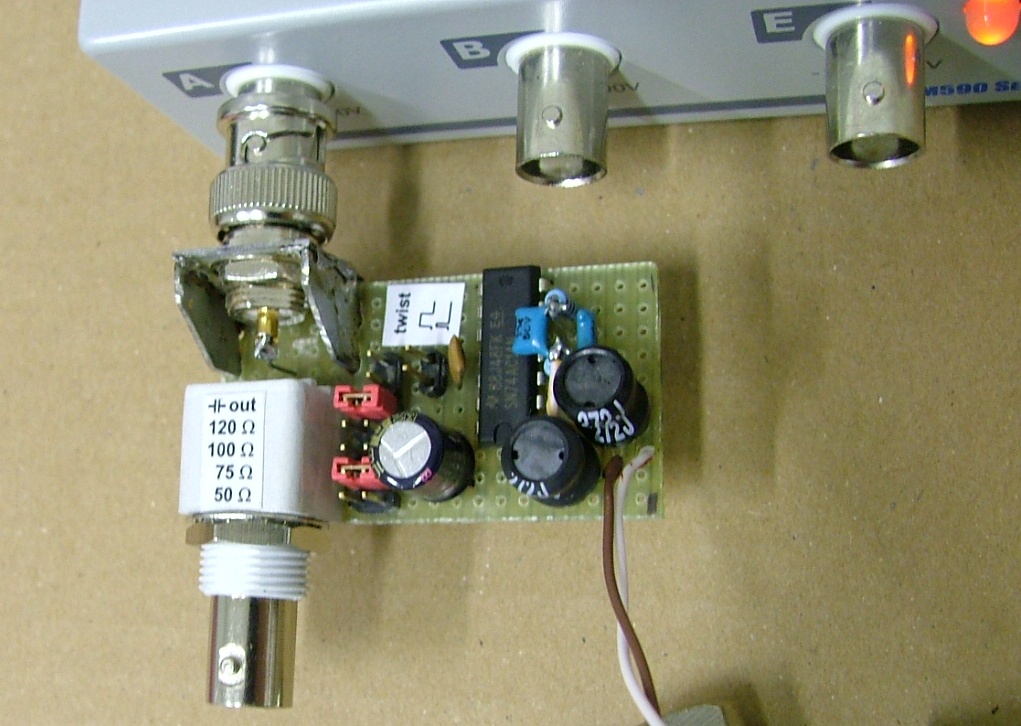 The output of the booster (power stage) has a reasonably low impedance, and is matched to the transmission line using a resistor in series. I included four different resistors, selectable by a jumper, to accomodate the typical cabling impedances of RF coax cables and twisted pair cables. Note that the precise matching at the transmitter is not all that important - if you want to estimate the impedance of an unknown cable, just try some value at the transmitter and focus on the far end reflection. The far end is where you try to achieve the optimum matching, by adjusting the terminator resitance - it is the far end reflection that's well visible (unlike a local mismatch at the transmitter, which causes just a bit of glitching at the pulse edges).