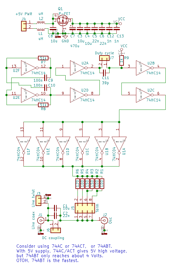 of the oscillation), and a 74AC04 (all six gates in parallel)